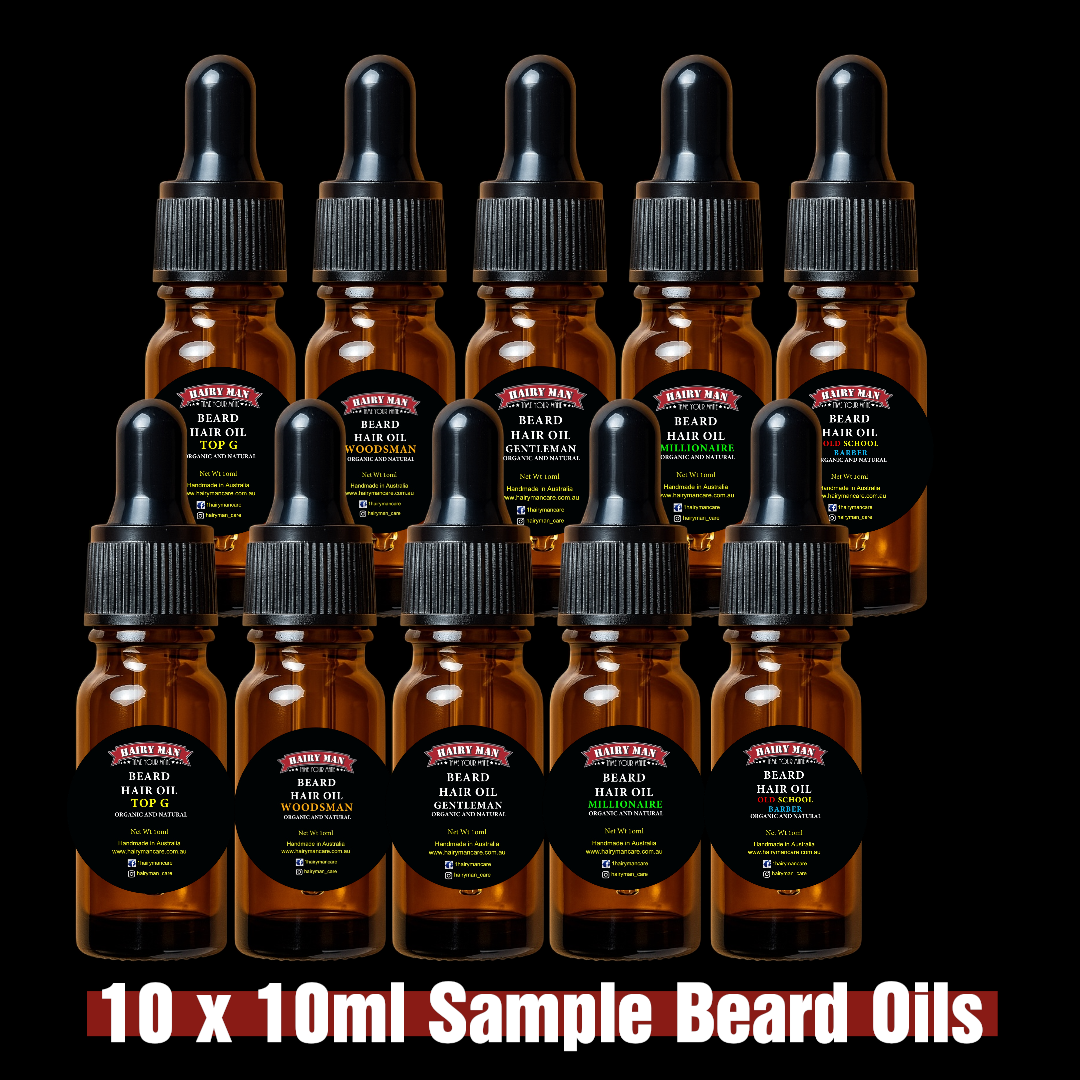 Discover premium beard nourishment with Hairy Man Care’s Mini Beard Oil Pack—a must-have for men looking to boost beard growth, soften coarse hair, and maintain a well-groomed look. This exclusive set includes 10 x 10ml bottles of handcrafted all-natural beard oils, each designed to moisturize the skin, reduce itchiness, and prevent beard dandruff.